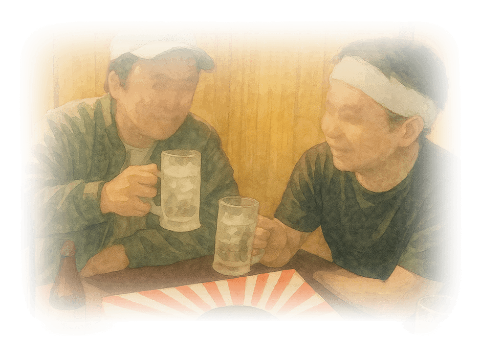 常連の男と、大将がいつものようにグラスを傾けながら、ぽつりぽつりと話す夜。